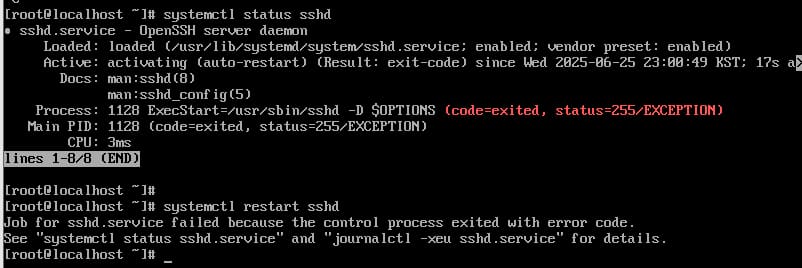 화면에서 systemctl status sshd 명령 결과, OpenSSH 서버(sshd)가 정상적으로 실행되지 않고 다음과 같은 오류가 발생하고 있습니다.