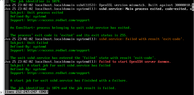 | sshd 빌드 버전: OpenSSL 3.0.1 (30000010) 현재 시스템 버전: OpenSSL 3.2.2 (30200020) 결과: 버전 불일치로 인한 SSH 서비스 실행 실패 |