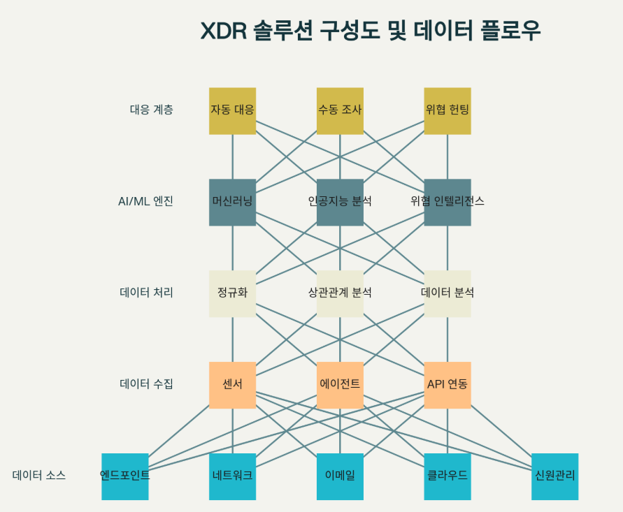 ■ XDR 솔루션의 구성 요소와 데이터 플로우를 보여주는 아키텍처 다이어그램