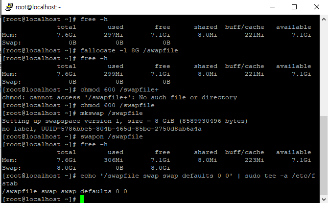 | [root@localhost ~]# fallocate -l 8G /swapfile ※ fallocate이 안 되는 파일시스템일 경우 dd if=/dev/zero of=/swapfile bs=1M count=4096 |
