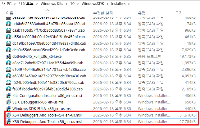 □ 다운로드된 폴더 → Installers → X64 Debuggers And Tools-x64_en-us.msi 실행하여 설치