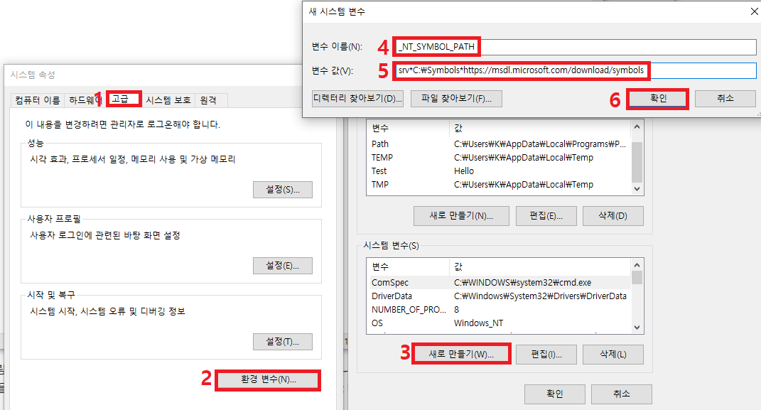 1) 시스템 속성(sysdm.cpl ) 실행 → 고급 → 환경 변수 → 시스템 변수 영역에서 새로 만들기 → 변수이름, 변수 값 추가