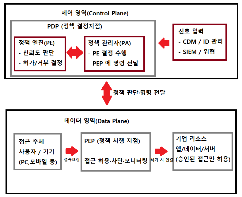 | [재택 직원 기기] ↓ (1) 접속 요청 [PEP - 접근 게이트웨이] ↕ (2) 신뢰도 판단 요청/응답 [PDP - 정책 엔진 + 정책 관리자] └ 입력 신호: MFA 결과 + 기기 상태 + 위치 + 행동 이상 여부 ↓ (3) 허가 시에만 연결 [기업 내부 리소스 (앱/데이터/서버)] |