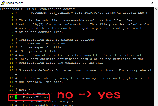 22번 째줄에 있는 ForwardX11 no => yes 으로 변경합니다.