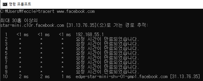 tracert 결과에서 응답시간이 * 로 표시되는 경우는 침입차단시스템 등의 접근 통제 리스트에 의해 tracert의 UDP 패킷이 차단되었음을 의미합니다.