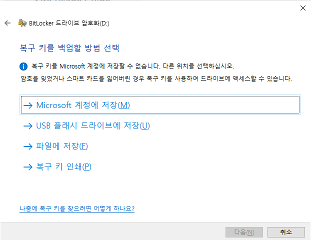 1) Microsoft 계정에 저장 : Windows 10 설정 시 설정했었던 Microsoft 계정에 복구 키를 저장합니다. 이 기능은 로컬 계정으로는 사용할 수 없습니다.