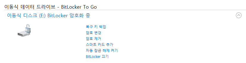 Bit Locker 초기 설정 페이지 ( 제어판 -> 시스템 및 보안 -> BitLocker 드라이브 암호화 )에서는 암호화 해제된 드라이브에 대해서 복구 키 백업, 암호 변경, 암호 제거 등 설정을 변경할 수 있습니다.