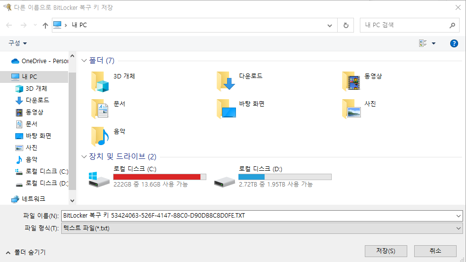 3) 파일에 저장 : C드라이브, D드라이브와 같은 내 PC 드라이브에 복구 키를 저장합니다.