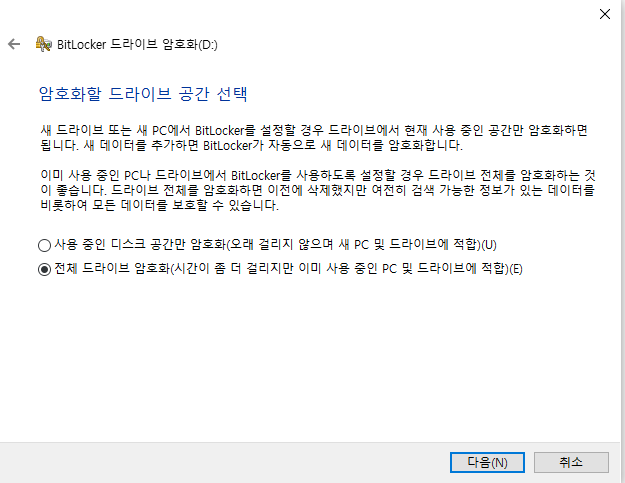 "암호화할 드라이브 공간 선택" 단계에서는 새 드라이브 인지, 기존에 사용하던 드라이브인지에 따라 선택을 합니다.