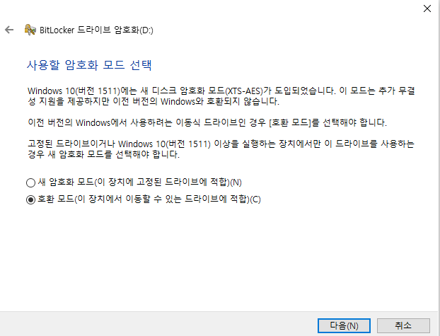"호환모드"는 윈도우 10 1511 하위 버전을 사용하거나 이동식 디스크를 암호화할 경우 해당 모드를 설정합니다.